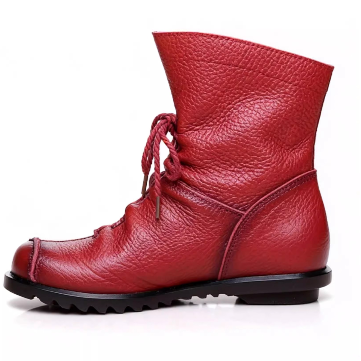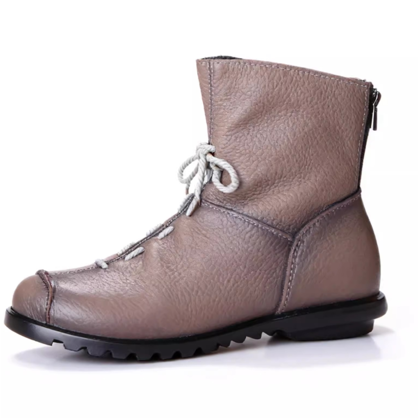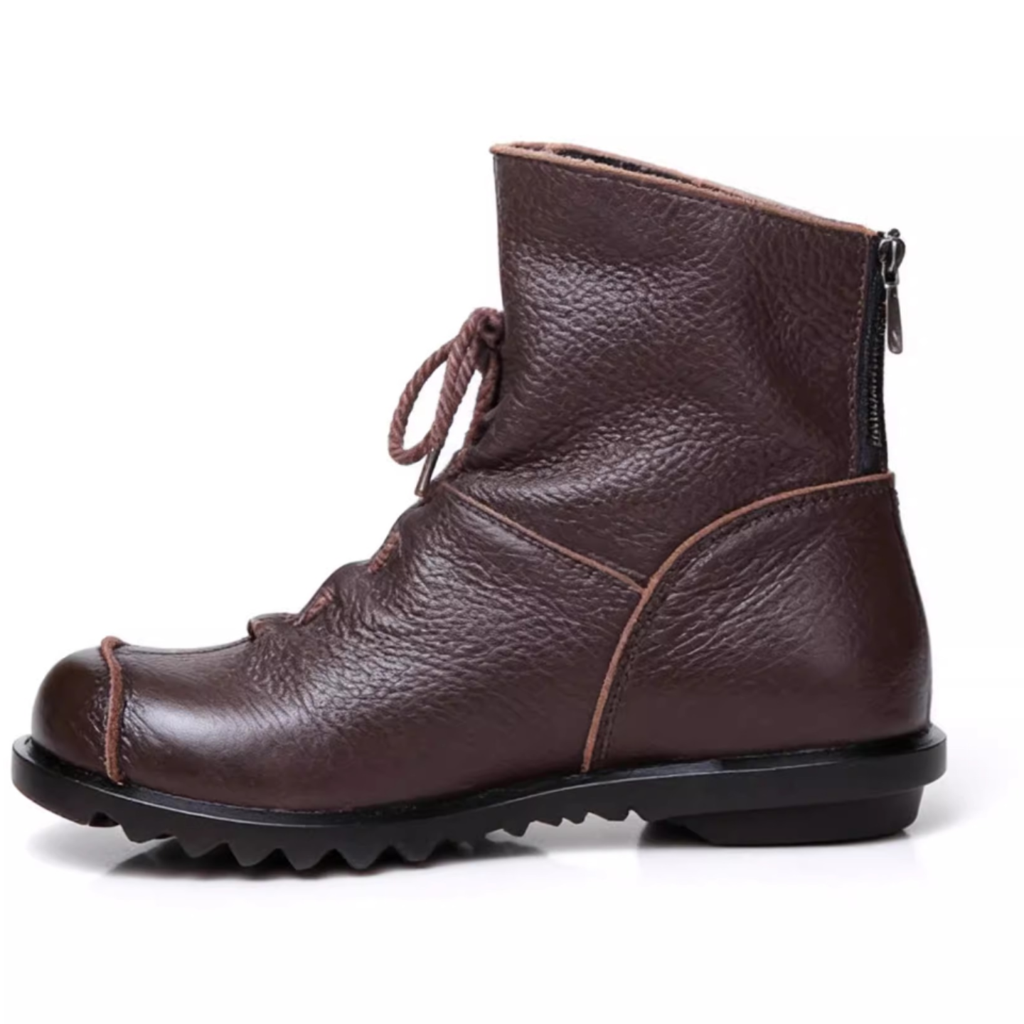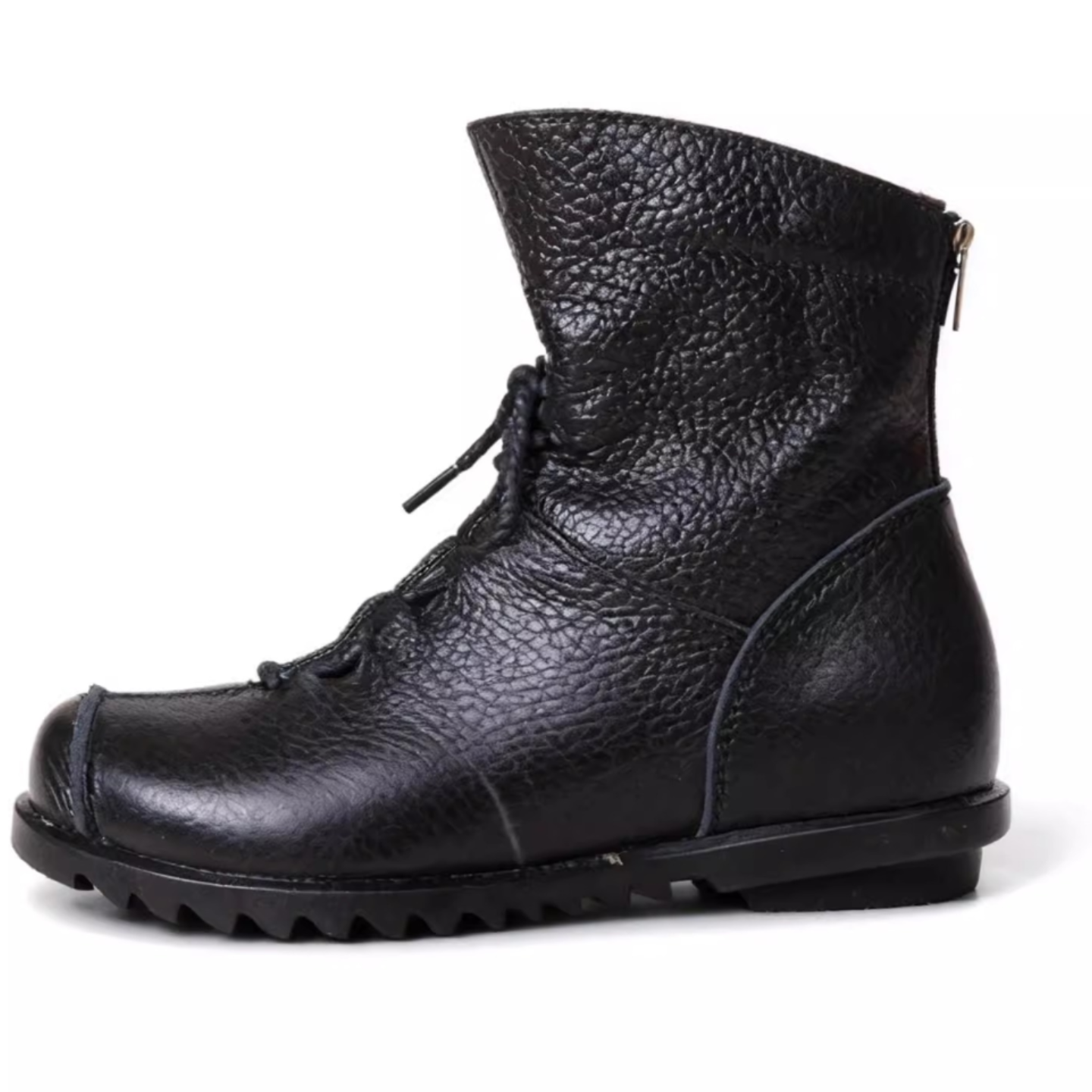 Dessa vintageinspirerade stridsstövlar för kvinnor är tillverkade av högkvalitativ nötköttsskinn, som är mjukt och hållbart. Den låga kilklacken (1-3 cm) ger komfort, och sidodragkedjan gör dem lätta att ta på och av. Fodret finns antingen enkellager eller fleece för extra värme under vår, höst och vinter. Deras klassiska design med rund tå ger en minimalistisk och vintage känsla.